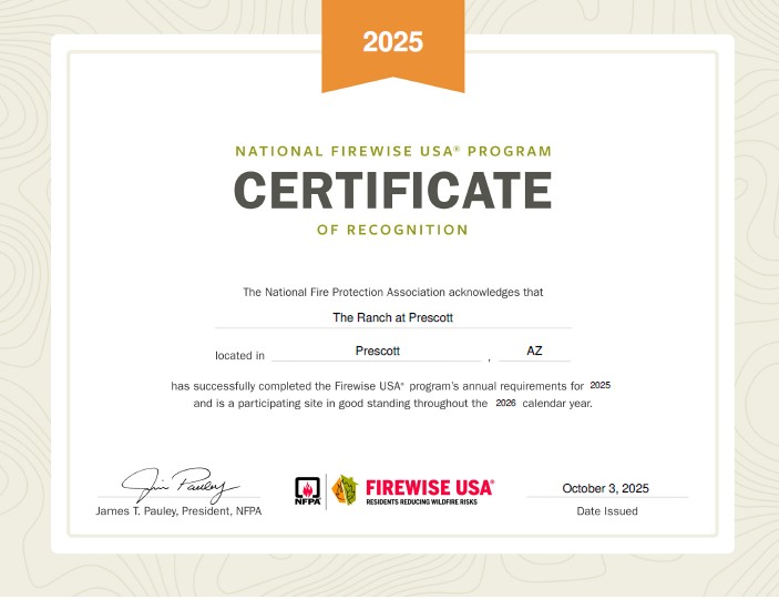 Our mission is to reduce the potential for life and property losses from potential wildland- urban interface fires by providing all property owners of the Ranch at Prescott with the ability and knowledge to reduce the potential risk(s) associated with excess brush or dead trees on their respective properties.